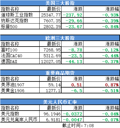 当地时间周二,欧美股市全线收跌,道指跌超230点,衡量市场恐慌程度的CBOE波动率指数(VIX)大涨逾10%,银行板块普遍走低。美国农产品期货集体大涨。金价收跌0.5%,失守1280美元关口。据报道,美国中西部地区的洪水流经美国主要原油储存库所在地俄克拉荷马州库欣地区,使油价得到提振,美油收高近0.9%。