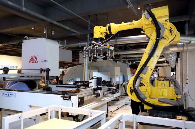 在江西省赣州市南康区举行的中国(赣州)第六届家具产业博览会上展示的现代化家具制造设备