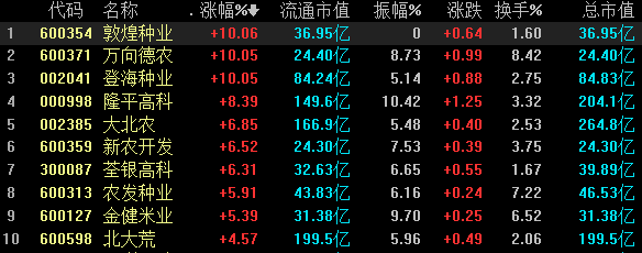 继昨日午后靓丽表现之后,种业概念板块今日延续强势,敦煌种业、万向德农、登海种业3股率先涨停,隆平高科涨超8%,大北农、新农开发、荃银高科等个股纷纷拉升。