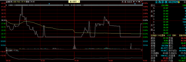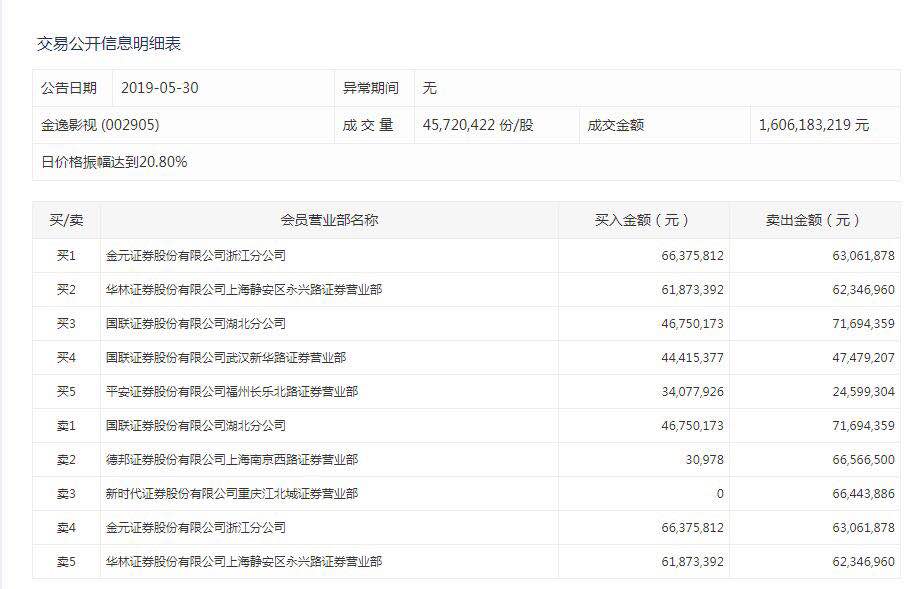 截至收盘,金逸影视报37.39元/股,跌2.22%,成交额16.06亿元,总市值100.50亿元,换手率高达68%。盘后数据显示,金元证券浙江分公司买入6637万元并卖出6306万元,华林证券上海永兴路买入6187万元并卖出6234万元。