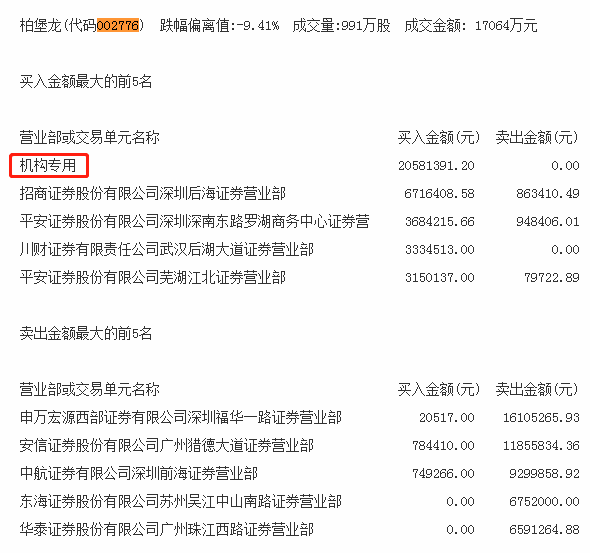 从详细数据看,机构今日买入最多的柏堡龙有1家机构买入,净买入金额2058万元。