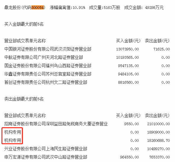在卖出排行榜上,机构卖出最多的鼎龙股份有2家机构卖出,净卖出金额3716万元。