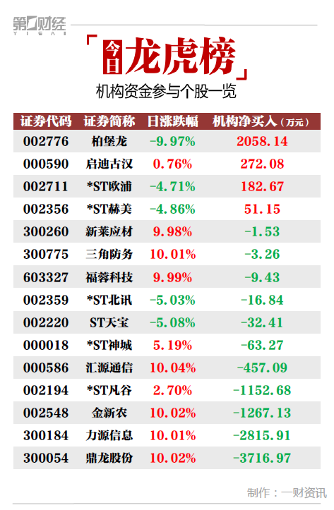 当天机构净卖出前三的股票分别是鼎龙股份、力源信息、金新农,净流出金额分别是3716万元、2815万元、1267万元。
