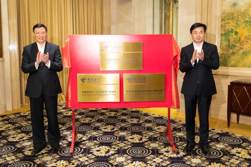 应勇、柯瑞文见证签约,并共同为天翼智慧家庭科技有限公司、中国电信网络与信息安全研究院、中国电信5G+工业互联网产业基地揭牌。