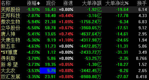 今日早盘,三大股指震荡走低,猪肉股大幅杀跌,天邦股份触及跌停,正邦科技跌超7%,傲农生物、天康生物、唐人神、立华股份跌逾5%,新五丰跌超4%。