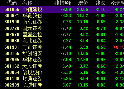 周一早盘,券商板块大幅跳水,截至发稿,板块整体跌超4%,中信建投逼近跌停,华鑫股份跌8%,国元证券、南京证券、东北证券、国盛证券等跌超7%,天风证券等集体单边下挫。