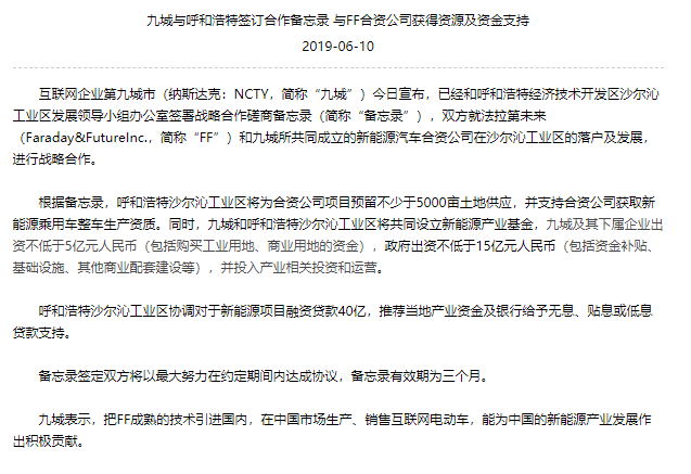 第九城市今日在公司官网发布消息称,已经和呼和浩特经济技术开发区沙尔沁工业区发展领导小组办公室签署战略合作磋商备忘录,双方就法拉第未来(简称:“FF”)和九城所共同成立的新能源汽车合资公司在沙尔沁工业区的落户及发展,进行战略合作。