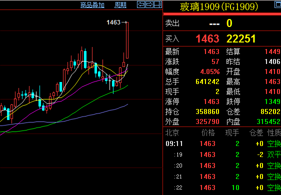 周二早盘,玻璃期货主力合约FG1909延续夜盘涨势,开盘封死涨停,价格创逾9个月新高。截至发稿报1463元每吨,涨停板封单超过2万手。