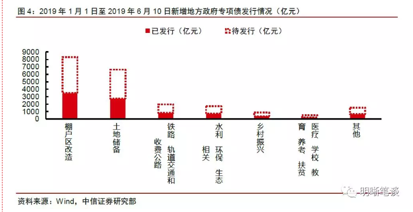 今年地方专项债规模为21500亿元,截至6月10日专项债实际发行了近9000亿元,剩余的额度需要在9月底前发完。目前专项债筹资主要用于棚户区改造和土地储备,机构统计用于高速公路、铁路、供水供电项目的专项债不足900亿元,占发行总量约9%。