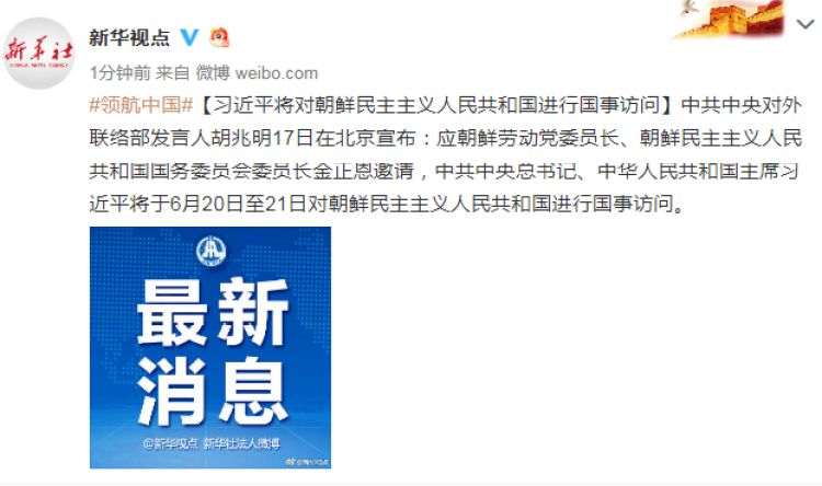 中共中央对外联络部发言人胡兆明17日在北京宣布:应朝鲜劳动党委员长、朝鲜民主主义人民共和国国务委员会委员长金正恩邀请,中共中央总书记、中华人民共和国主席习近平将于6月20日至21日对朝鲜民主主义人民共和国进行国事访问。