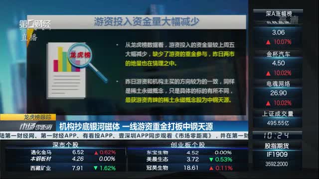 龙虎榜中机构席位资金净卖出0.48亿元,其中,净买入的个股5只;净卖出的个股7只。净买入较多个股分别是银河磁体、铭普光磁、金宇车城等;机构净卖出居前个股分别为润达医疗、江铃汽车、蓝焰控股等。游资投入的资金量较上周五大幅减少,最获游资青睐的稀土永磁概念股为中钢天源。