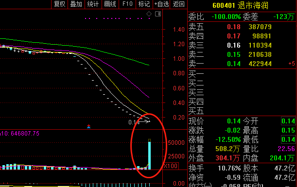 周三,退市海润继续无悬念跌停,股价报0.14元,再度刷新A股最低价纪录。但与此同时,今日盘中多次开板,成交量急剧放大创出近3年来新高,显示有超过7000万资金买入。