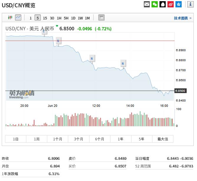 6月20日,在岸、离岸人民币兑美元相继升破6.85关口,日内分别涨近600个基点、450个基点,续刷5月13日以来新高。在岸人民币兑美元收盘报6.8505,较上一交易日上涨535点。截至发稿,在岸人民币兑美元报6.8500。