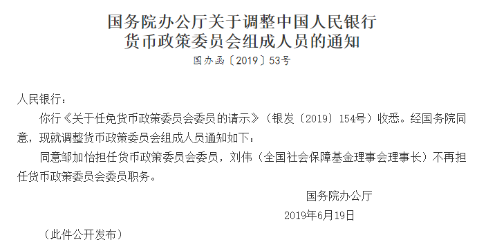 国务院办公厅发布关于调整中国人民银行货币政策委员会组成人员的通知,同意邹加怡担任货币政策委员会委员,刘伟(全国社会保障基金理事会理事长)不再担任货币政策委员会委员职务。