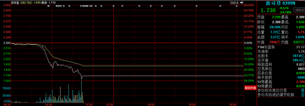 受该消息影响,波司登股价闪崩,股价一度下跌近27%,市值蒸发超50亿港元。截至停牌前,波司登报1.73港元,下跌24.78%。