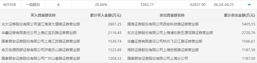 买三为国泰君安证券上海江苏路营业部,该席位买入1539.74万元。卖三为华鑫证券杭州飞云江路证券营业部,该席位卖出1566.61万元。卖五为国泰君安证券上海分公司,该席位卖出1187.00万元。