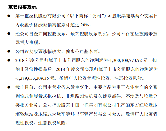 一拖股份6月25日晚间提示风险称,目前公司主营业务未发生变化,主要产品为用于农业生产的全系列轮式和履带式拖拉机、非道路柴油机及关键零部件,不涉及与垃圾分类相关业务。公司控股股东一拖集团生产的东方红垃圾压缩转运站及压缩式垃圾车等环卫车辆产品与公司无关。
