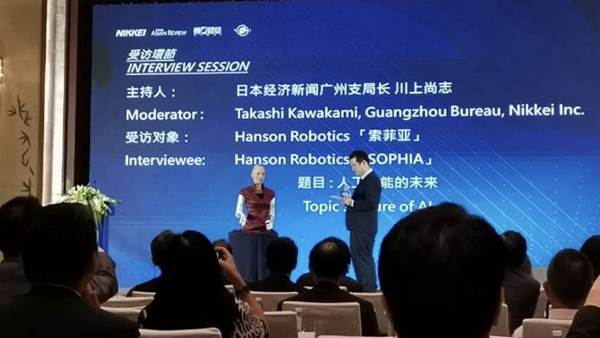 6月25日,索菲亚来到深圳出席第一财经联合日本经济新闻社主办的亚洲科技创新大会。
