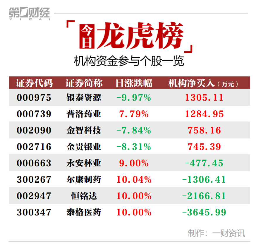 当天机构净买入的三只股票分别是银泰资源、普洛药业、金智科技,净买入金额分别为1305万元、1284万元、758万元。