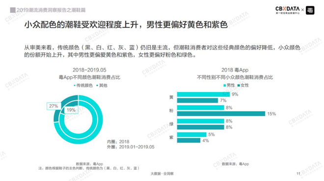 6)小众配色潮鞋更受潮鞋消费者欢迎,男性更偏爱黄、紫,女性更偏好粉、绿;
