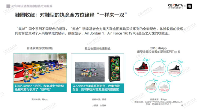 正如直男搞不懂女生对整套口红盒的迷恋一样,鞋头们有连鞋盒都要集齐成套的心理,想必也是让圈外人看不懂。如Air Jordan 1,收集其中七款配色被戏称为收集了“葫芦娃”;集齐Adidas七龙珠系列的七个配色,虽不能召唤七龙珠,却可以用鞋盒拼出一副完整图案。这种把“集鞋”当“集邮”来玩儿的潮鞋一族,不仅是个人对潮鞋钻研劲儿的彰显,更奠定了“氪金”玩家的地位。根据CBNData《报告》中所示的毒App最受收藏控喜爱的潮鞋系列来看,Air Jordan 1,Nike Air Force 1和Converse 1970s是2018年当之无愧的收藏热门王。