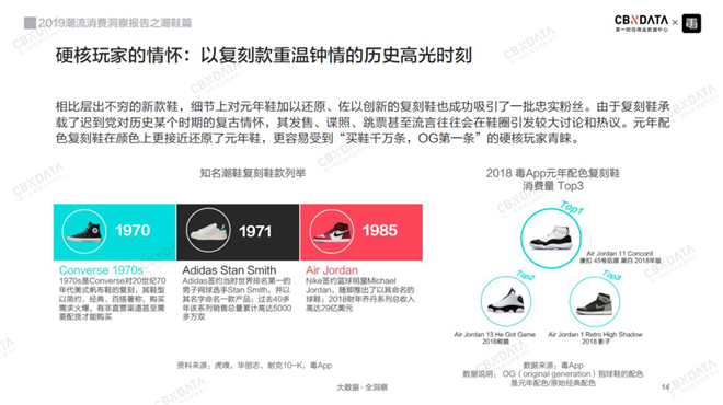 鞋圈的怎能不知道“OG”(元年版,即采用原始经典配色的鞋款),而一般常常和“OG”一起出现在鞋盒上的还有另一个词“RETRO”(复刻版)。而在细节上对元年鞋加以还原、佐以创新的复刻鞋,则和元年鞋一样成功吸引了一批Sneaker控。而一个鞋盒上同时出现“OG”和“RETRO”,那么这双鞋一定是硬核鞋头的菜。