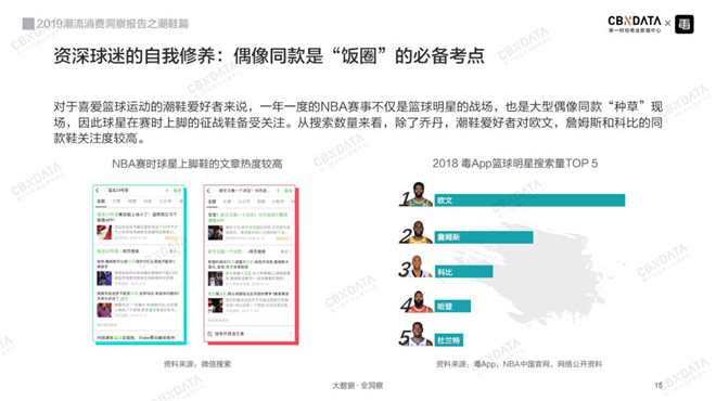 在潮鞋圈里还有这样一群球迷鞋头,大家关注“新鞋发售”日历的时候,他们可能更关注篮球比赛日程,因为对他们而言,这一年一度的NBA赛事不仅是篮球明星的战场,更是大型偶像同款“种草”现场啊。这也就怪不得为啥知名球星每次登场时。脚上的征战鞋都备受关注了,根据CBNData《报告》显示,从2018年毒App平台上篮球明星搜索数量来看,除了乔丹,潮鞋爱好者对欧文、詹姆斯和科比的同款球鞋都持有较高的关注度。