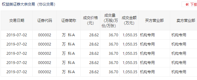 7月2日,万科A发生5笔大宗交易,总成交数量为183.50万股,总成交金额为5251.75万元,成交均价为28.62元,大宗交易成交金额占当日成交金额3.33%,折价0.83%。