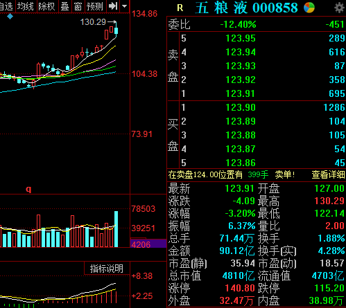 其中,五粮液遭北向资金逢高抛售,今日五粮液盘中股价翻红,最高报130.29元/股,续创历史新高。而该股午盘却持续走低,最终收报123.91元,跌3.2%。
