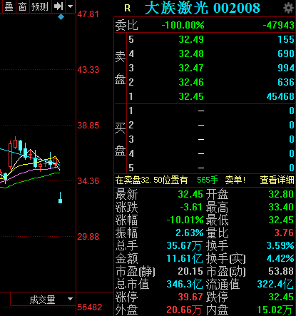 大族激光今日跌停,收报32.45元,换手率3.59%,成交额11.61亿元。根据Choice数据,大族激光7月15日遭遇主力净流出,买入的多为净小单,该公司近5日连续遭遇主力减持。