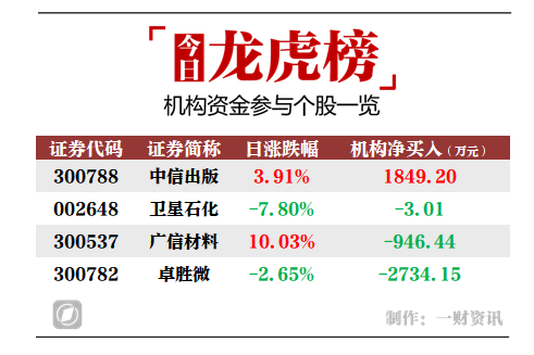 当天机构净卖出前三的股票分别是卓胜微、广信材料、卫星石化,净流出金额分别是2734万元、946万元、3万元。