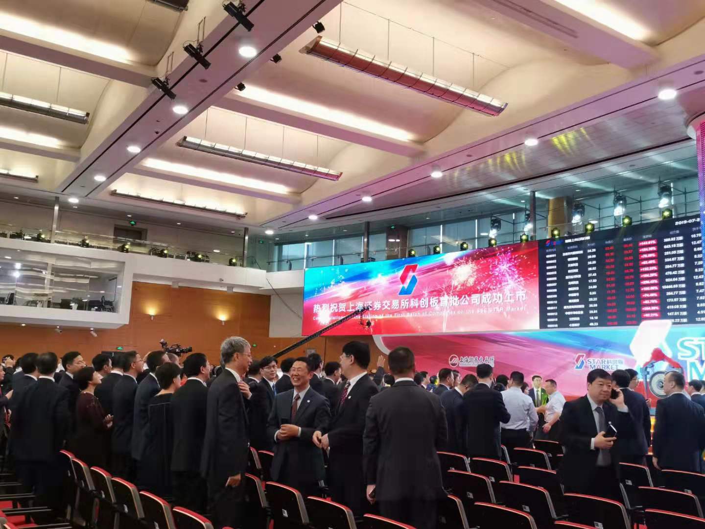 提前到来的上市企业、中介机构人士,争先在显示有“科创板首批公司上市仪式”的大屏幕前合影留念。面对一两个小时后就上市交易的公司股票,首批上市企业的董事长毫不掩饰脸上的喜悦,但也都表示,不会过度关注短期股价,会更好地推动主业发展。