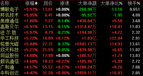 5G概念股7月23日盘中异动,博敏电子、邦讯技术涨停,奥维通信、高斯贝尔涨超6%,法尔胜、华工科技、欣天科技等涨超5%,广和通、超讯通信等多股跟涨。