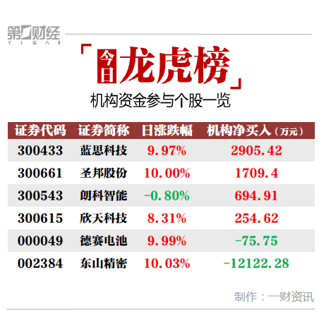 当天机构净买入前三的股票分别是蓝思科技、圣邦股份、朗科智能,净买入金额分别是2905万元、1709万元、695万元。