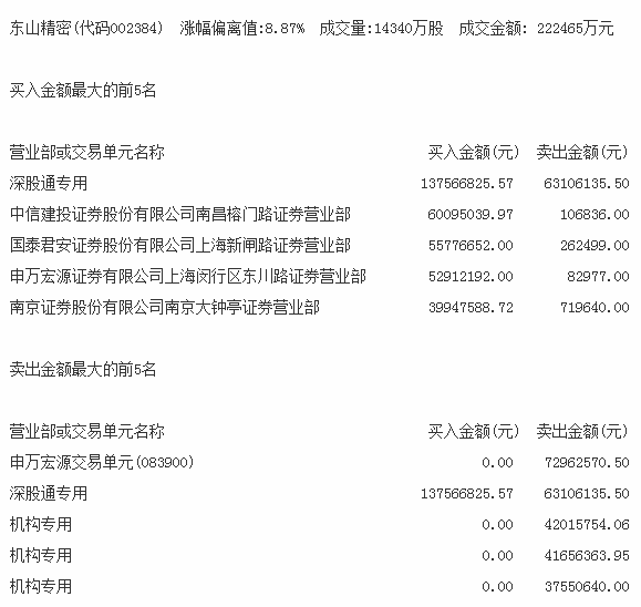 在卖出排行榜上,机构卖出最多的东山精密3家机构卖出,净卖出1.21亿元。同时,深股通席位净买入约700万元。