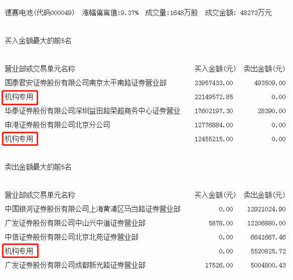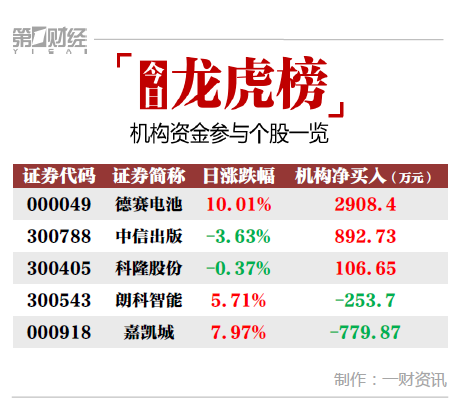 当天机构净买入前三的股票分别是德赛电池、中信出版、科隆股份,净买入金额分别是2908万元、893万元、107万元。