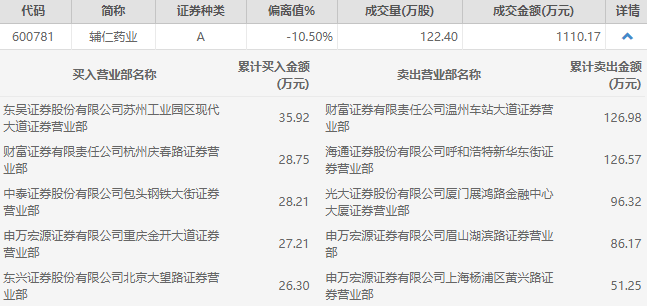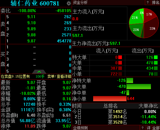 截至今日收盘,辅仁药业报9.07元,跌10.02%,成交额1110万元,换手率0.33%。