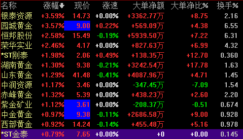 7月30日午后,黄金股快速拉升,截至发稿,银泰资源、园城黄金涨超3%,恒邦股份、湖南黄金、山东黄金、紫金矿业等多股走高。