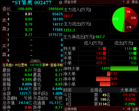 7月30日,*ST雏鹰再度跌停,报价0.77元,收盘跌停板上封单超390万手,总市值跌至24.14亿元。*ST雏鹰已连续18个交易日收盘价格均低于1元,在接下来的2个交易日*ST雏鹰即便连续涨停也不能重回1元,成面值退市第二股几乎板上钉钉。