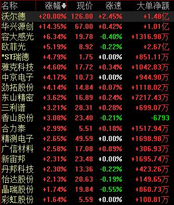 8月1日午后,科创板沃尔德持续拉升,截至发稿,该股涨停,报126元,该股近8个交易日涨幅125%。与此同时,该股所属的OLED概念也大幅上涨,截至发稿,科创板华兴源创涨逾14%,容大感光涨逾6%,欧菲光涨逾5%,*ST瑞德、雅克科技、中京电子、劲拓股份涨逾4%,其余个股纷纷跟涨。