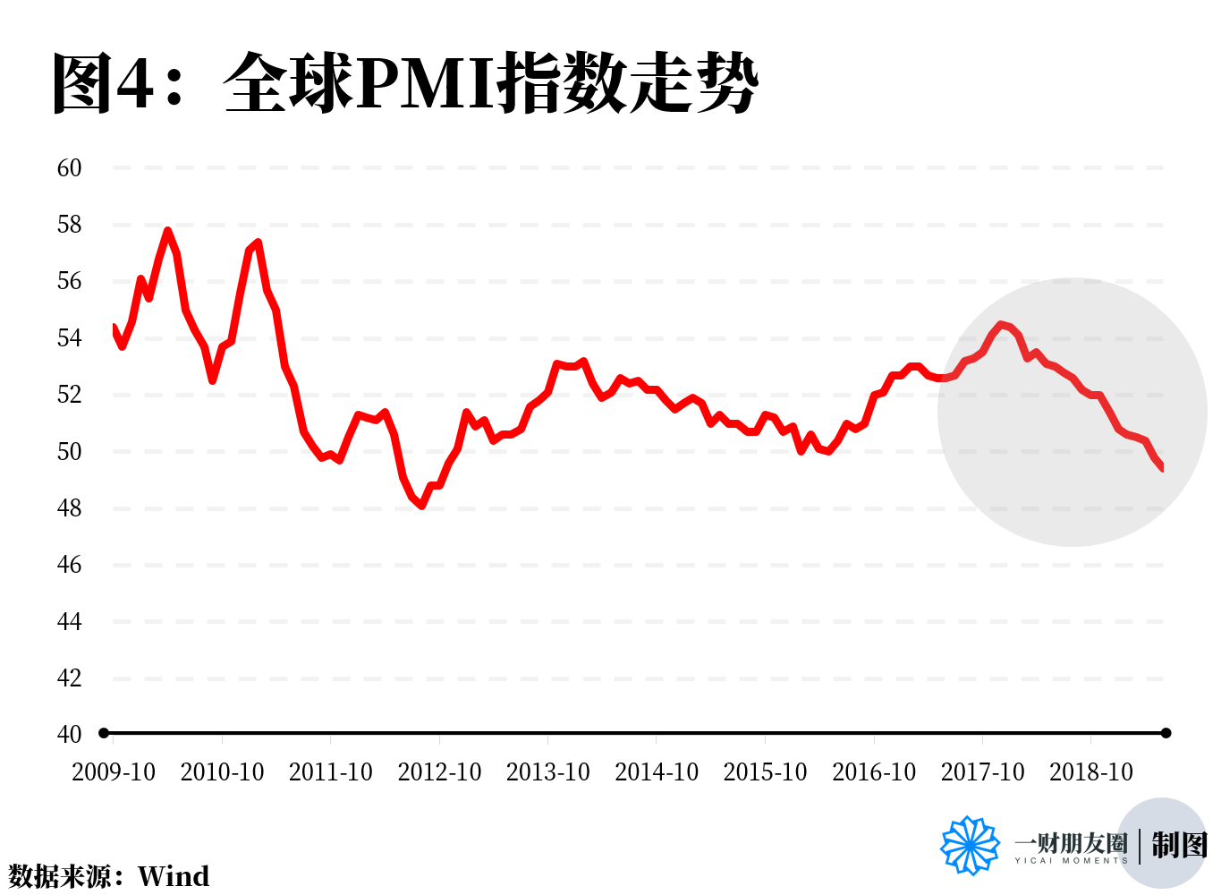 不仅如此,货币政策收紧对实体经济的影响也是显而易见的。叠加全球贸易紧张局势升级、对技术供应链中断的担忧以及地缘政治紧张局势的影响,从2018年下半年开始,全球经济疲态尽显。作为领先指标的各国制造业PMI数据一路下行,通胀持续疲软,离各大央行2%的通胀目标渐行渐远,甚至有些经济体再次面临通缩风险,大部分新兴市场经济体更是雪上加霜。特别是作为全球增长龙头的美国经济内生增长动能疲弱,企业投资意愿不强,在特朗普减税效应消退后,美国经济下行风险明显上升,美债收益率曲线也出现长短期倒挂,预示着未来1-2年美国经济很可能将出现衰退。