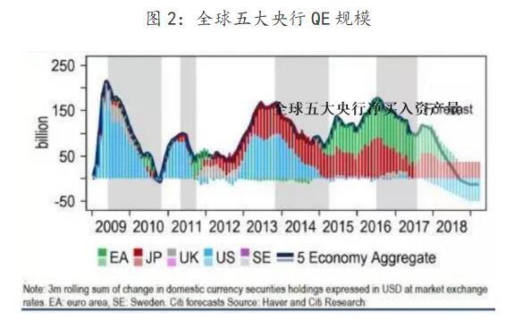 随着经济增长、通胀回升,面对空前宽松的货币政策环境,美联储从2014年底率先启动货币政策正常化,先宣布结束QE,然后开始缓慢小幅加息,最后开始缩减资产负债表规模。在美联储的影响下,其他主要央行也开始逐渐收紧货币政策,加拿大央行和英格兰银行先后于2017年加入加息队伍。2018年下半年开始,随着全球五大央行QE规模进入负增长,全球货币政策也从边际收紧转为全面紧缩阶段。