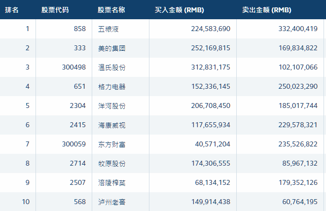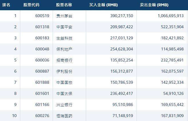 前十大成交股中,贵州茅台、中国平安、东方财富净卖出居前,分别遭净卖出6.76亿元、3.12亿元、1.95亿元;温氏股份逆市获净买入2.11亿元。