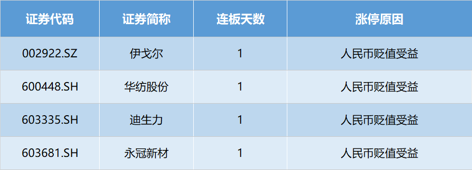受人民币贬值影响,人民币贬值概念股表现活跃,伊戈尔(002922.SZ)、华纺股份(600448.SH)、迪生力(603335.SH)、永冠新材(603681.SH)均涨停。