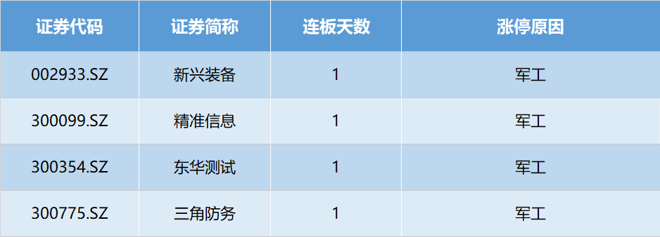 军工股冲高回落,个股方面,依然有新兴装备(002933.SZ)、精准信息(300099.SZ)、东华测试(300354.SZ)、三角防务(300775.SZ)涨停。