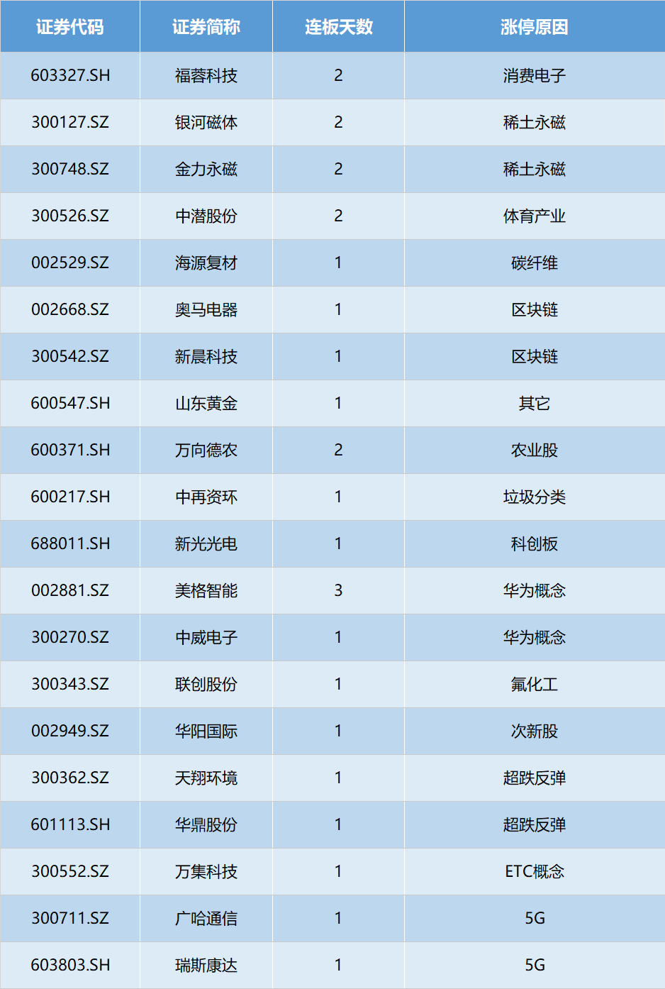 其他涨停个股较为分散,主要分布在5G、华为概念、区块链、稀土永磁等板块。