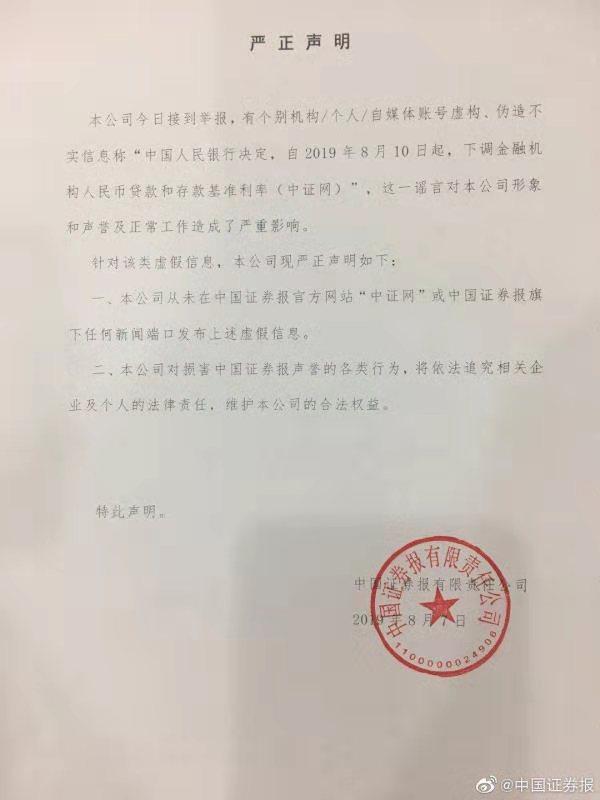 对此,中国证券报在官微回应称,本公司今日接到举报,有个别机构/个人/自媒体账号虚构、伪造不实信息称“中国人民银行决定,自2019年8月10日起,下调金融机构人民币贷款和存款基准利率(中证网)”,这一谣言对本公司形象和声誉及正常工作造成了严重影响。
