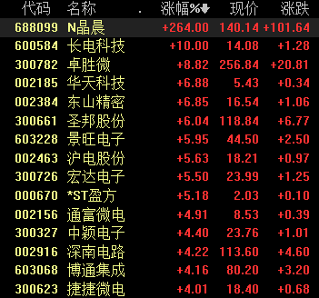 周二午后,在科创板晶晨股份的带动下,半导体及元件板块不断拉升,截至发稿,科创板晶晨股份涨264%,早盘一度大涨超300%,长电科技涨停,卓胜微涨近9%,华天科技、东山精密、圣邦股份涨超6%,景旺电子、沪电股份、宏达电子等跟涨。