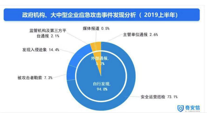 政企客户仍然缺乏足够的安全监测能力,报告指出,仅有73.1%的安全攻击事件是政府机构和企业通过日常内部安全运营巡检的方式自主查出的,而其余21.7%的安全攻击事件能够被发现,是因为其网络系统已经出现了显著的入侵迹象,或者是已经遭到了攻击者的敲诈勒索,甚者有些单位是在已经遭遇了巨大的财产损失后才发现自己的网络系统遭到了攻击。