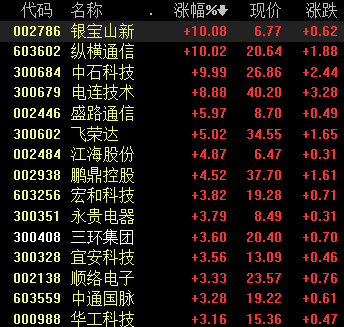 周二早盘,5G板块异动拉升,截至发稿,银宝山新、纵横通信、中石科技涨停,电连技术涨超8%,盛路通信、飞荣达涨超5%,宏和科技、中通国脉、江海股份等跟涨。